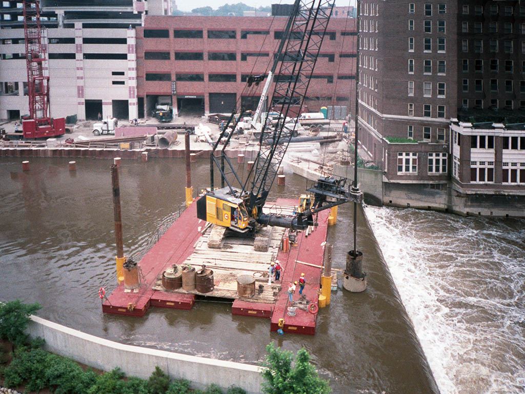 A number of standard attachments and accessories are available to augment drilling and service barge assemblies. Ramp units are easily added to basic assemblies to provide drive-on capability for truck-mounted equipment. Raked bow and stern sections can be utilized to minimize current effects and enhance stream navigation. Floating assemblies are positioned and held on location by holding spuds and other anchoring attachments which are designed to resist lateral forces due to wind, current, and on-deck equipment.