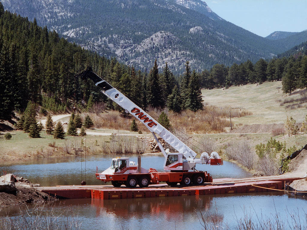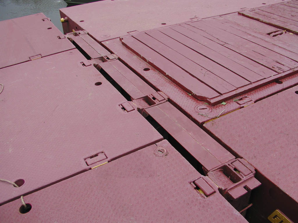 Deck surfaces can withstand localized loading of up to 5,000 pounds per square foot without damage or distortion. Bottoms of modules are also heavily reinforced so that traffic loads may be imposed on grounded assemblies, in some cases. Standard hinge attachments are available for use in longer spans to compensate for fluctuating water levels and to minimize hull stress as heavy, concentrated loads move across the deck.