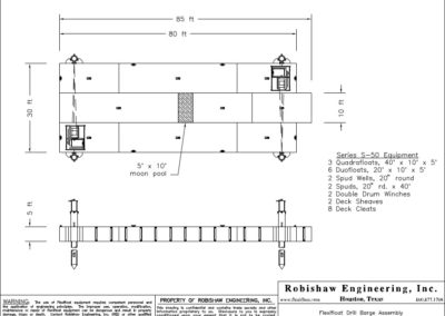 Franconia Minerals used a 30′ x 85′ Series S-50 Flexifloat® assembly for their core drilling machinery while performing a soils investigation on Birch Lake in Minnesota. A skid-mounted rig was centrally located on the barge and drilled through a 5′ x 10′ moon pool configured into the barge assembly. Four 40-foot-long spuds operated by two diesel-driven double drum winches anchored the platform at multiple locations on the lake.