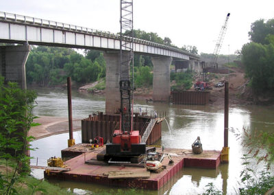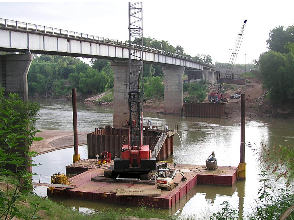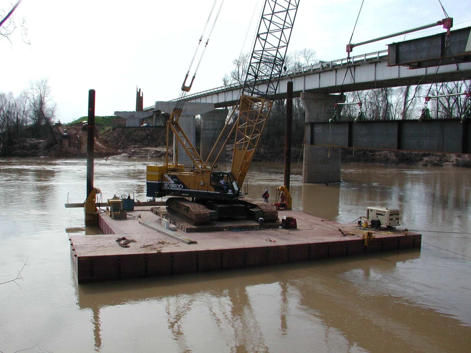 Lone Star Road Construction Co. used Series S-70 barge assemblies to support two crawler cranes during construction of a new highway bridge crossing the Brazos River near Hempstead, Texas. Two 150-ton crawlers worked from “T”-shaped configurations: Link-Belt LS-518, Kobelco 7150.