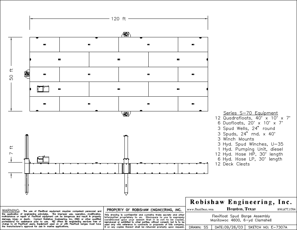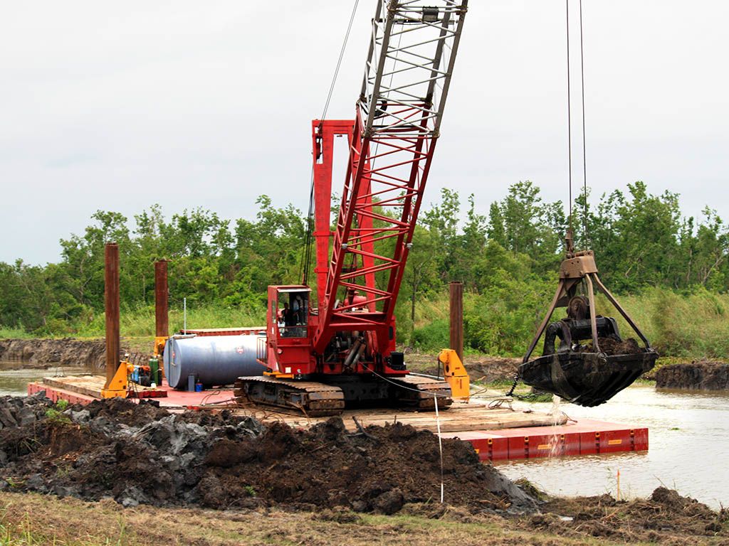 A 50′ x 120′ Series S-70 spud barge was used by Southern Delta Construction, LLC to support a Manitowoc 4600 crawler equipped with a 6-yard clamshell bucket. Three hydraulically-operated spuds anchored and helped navigate the barge while dredging Bayou Lafourche for the U. S. Army Corps of Engineers.