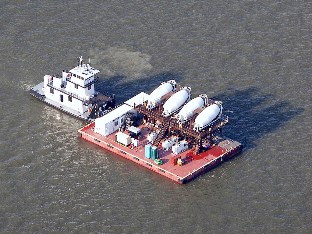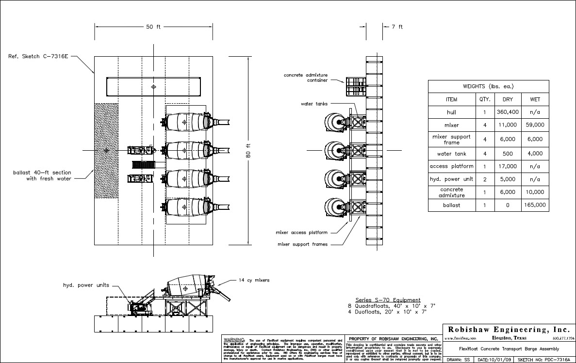 Washington Group/Alberici used a Series S-70 50′ x 80′ transport barge to support a concrete mixer plant at its U. S. Army Corps of Engineers Olmsted Lock and Dam project in Illinois. Ballasting was used to balance the asymmetric loading of the mixers.