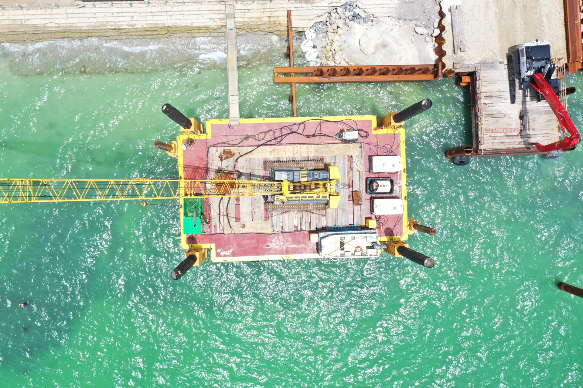 The Flexifloat SEP allowed Continental Heavy Civil to float the platform into position during high tide and then elevate it out of the water, enabling continued operations even as the tide receded. Elevating the platform above the ocean waves also provided a stable working surface—crucial for precise sheet pile installation.