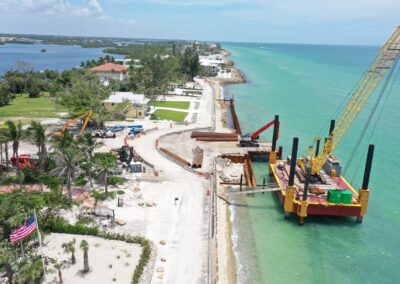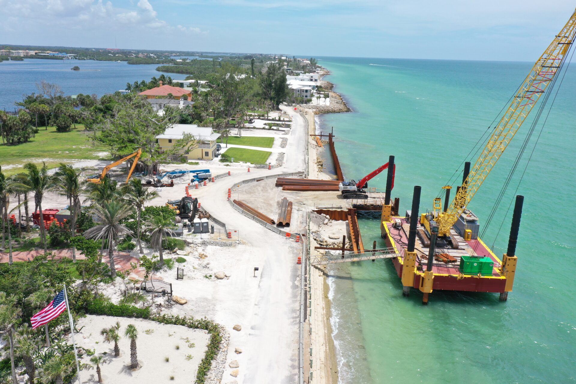 When tasked with driving sheet piles along the shallow tidal coastline of Casey Key, FL, Continental Heavy Civil turned to Flexifloat for a Self-Elevating Platform (SEP). The SEP was required to support a Kobelco CK1100G crawler crane operating a vibratory hammer over the area’s striking turquoise waters.