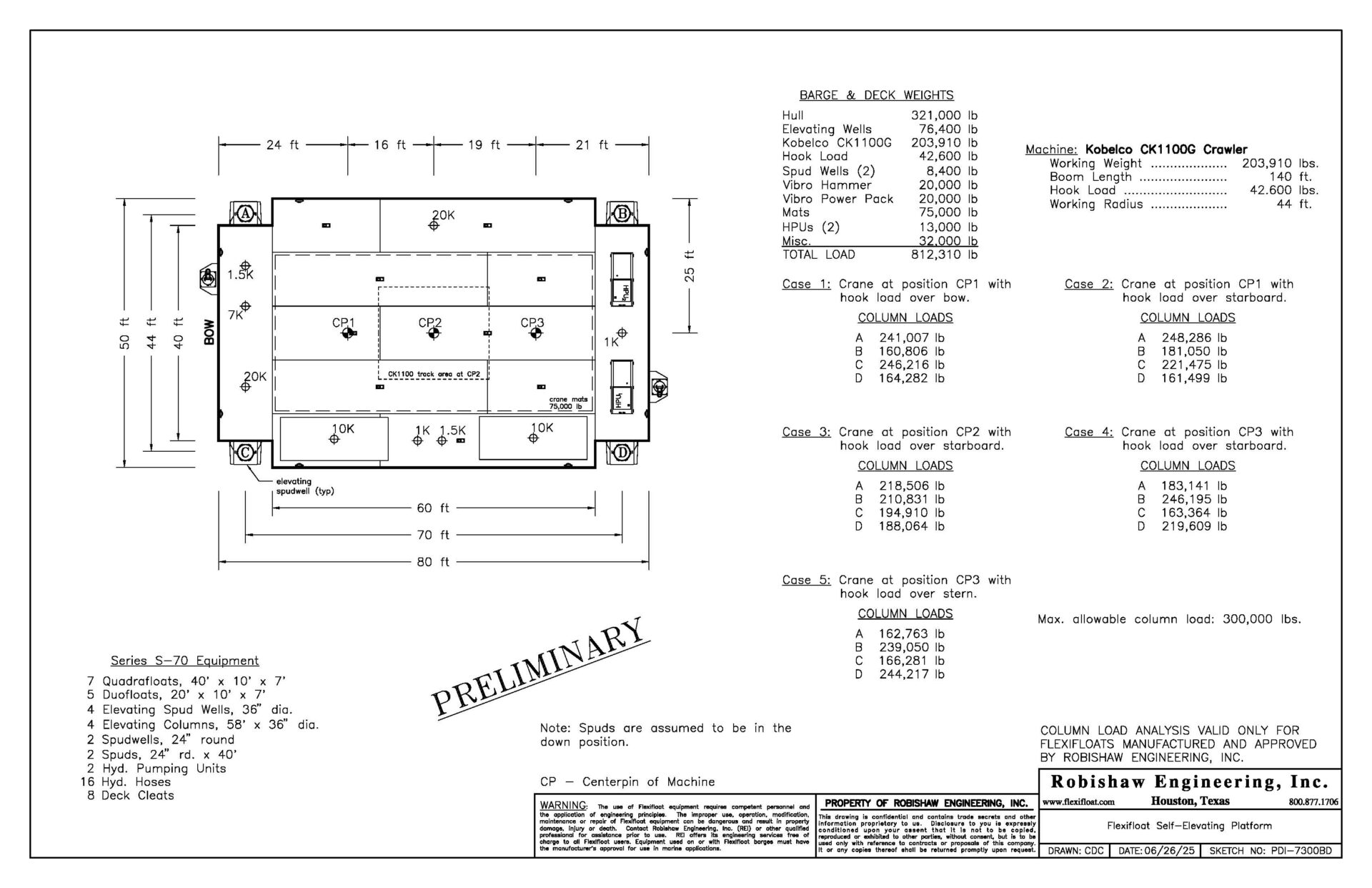Flexifloat SEPs have been reliably used around the world since the 1970s, with some of the original platforms still in service. Today’s models are equipped with a modern hydraulic power unit (HPU), powered by a low-emission Tier 4 diesel engine. These HPUs drive the elevating spudwells using environmentally friendly hydraulic fluid—offering contractors peace of mind when working in sensitive environments like the Florida coastline.