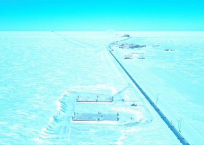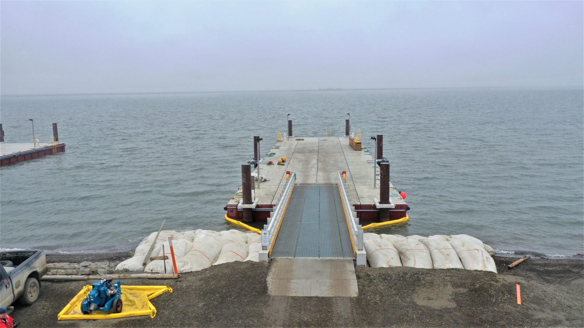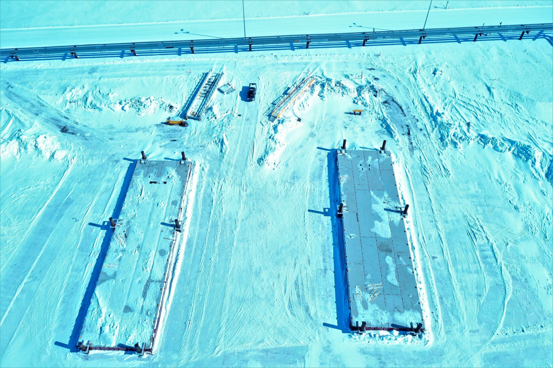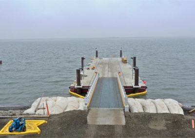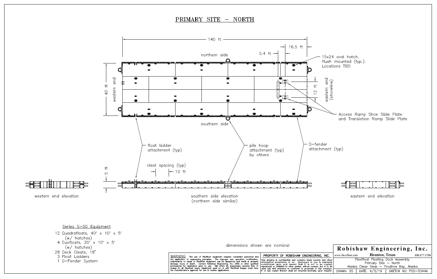 A total of 30 Quadrafloats™ (40’ x 10’ x 5’) and 10 Duofloats™ (20’ x 10’ x 5’) were used to assemble the 14,000 ft2 of Series S-50 Flexifloat® equipment needed for the three dock systems. Robishaw Engineering also provided custom fendering and access ladders. Additionally, a high-quality, durable paint system was applied in anticipation of the severe marine environment and subzero temperatures. A non-skid additive was included in the deck coating. Deck hatches were added to some of the floats for potential ballasting.