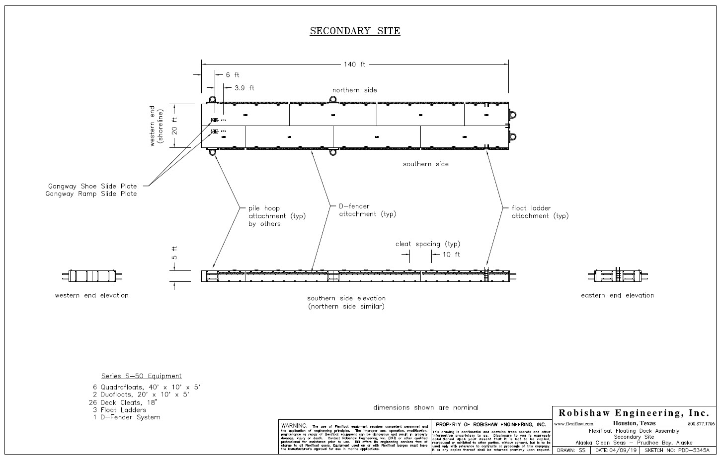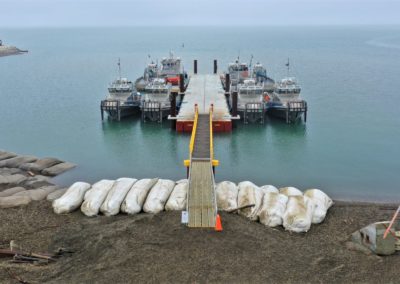 AFC selected Robishaw Engineering’s Flexifloat sectional barges to provide their client with an off-the-shelf system that was easy to assembly in the field under challenging site conditions at an extremely remote project location and that could withstand the harsh environmental elements such as the frequent subzero temperatures within the Arctic Circle. ACS was replacing an existing barge at their West Dock Moorage Facility with two 140’ x 40’ x 5’ floating docks and adding a 140’ x 20’ x 5’ platform at a secondary site nearby. In addition to being used for mooring response vessels, these three platforms are designed to allow for fuel truck and other vehicular access by means of heavy-duty steel ramps and pedestrian gangways supplied by AFC.
