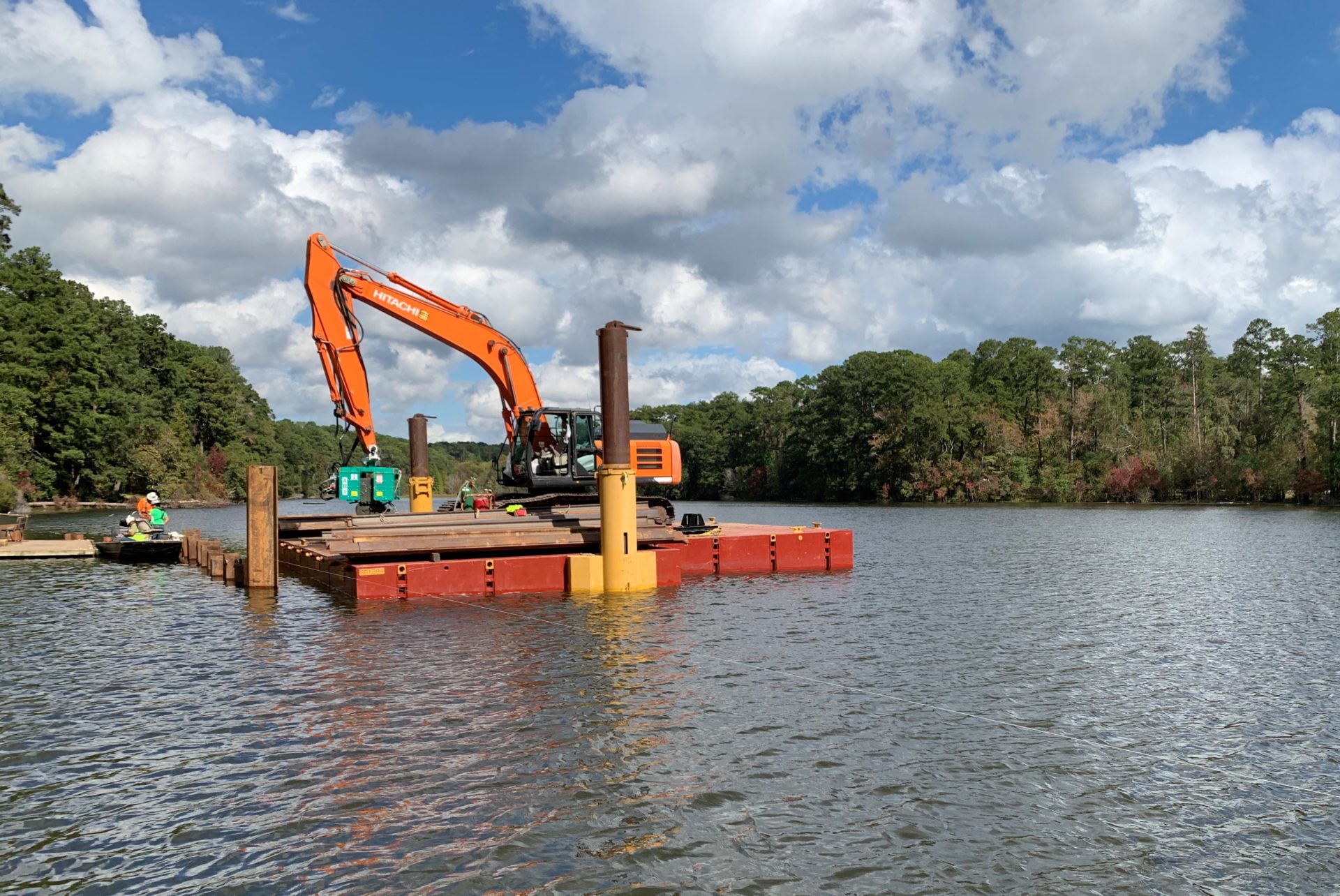 S & S Services used a 50′ x 40′ T-shaped S-50 assembly to support a Hitachi 300 excavator operating a vibratory hammer.  The arrangement was used to drive sheet piling around a historic boat dock located on Lake Raven within Huntsville State Park.  The existing structures were built in the late 1930s by the Civilian Conservation Corps.  The sheet pile wall allowed the contractor to dewater around the site so the dock and boathouse could be renovated in a dry work environment.