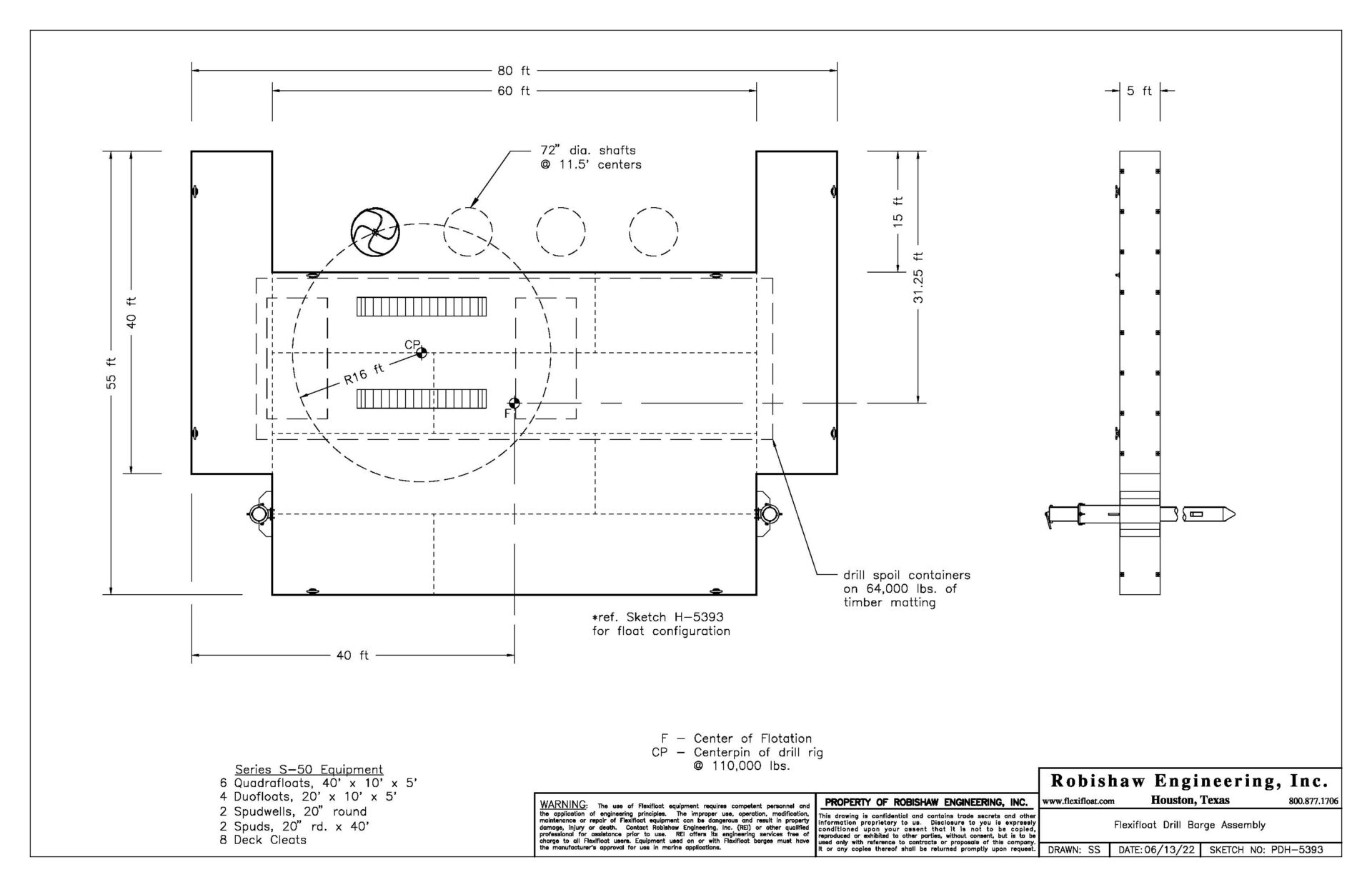 The S-50 equipment was first configured into a “U”-shaped spud barge to support a 110,000-pound track-mounted rig drilling 72-inch diameter pier shafts. The stable, 80-foot-wide Flexifloat configuration was designed to surround the ensuing bent within its 60-foot opening allowing the machine to drill each of the four 72-inch diameter shafts spaced at 11.5-foot centers without having to reposition the barge.