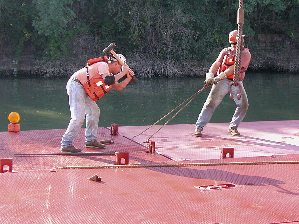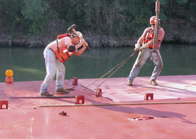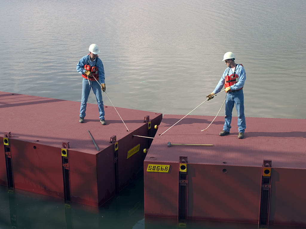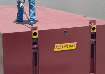 Flexifloats can be quickly assembled by construction crews without the need for specialized tooling or equipment. Pry bars, sledgehammers and rope are used, along with a crane for rapid installation. The individual flotation units are placed into the water and locked together to form the desired assembly.