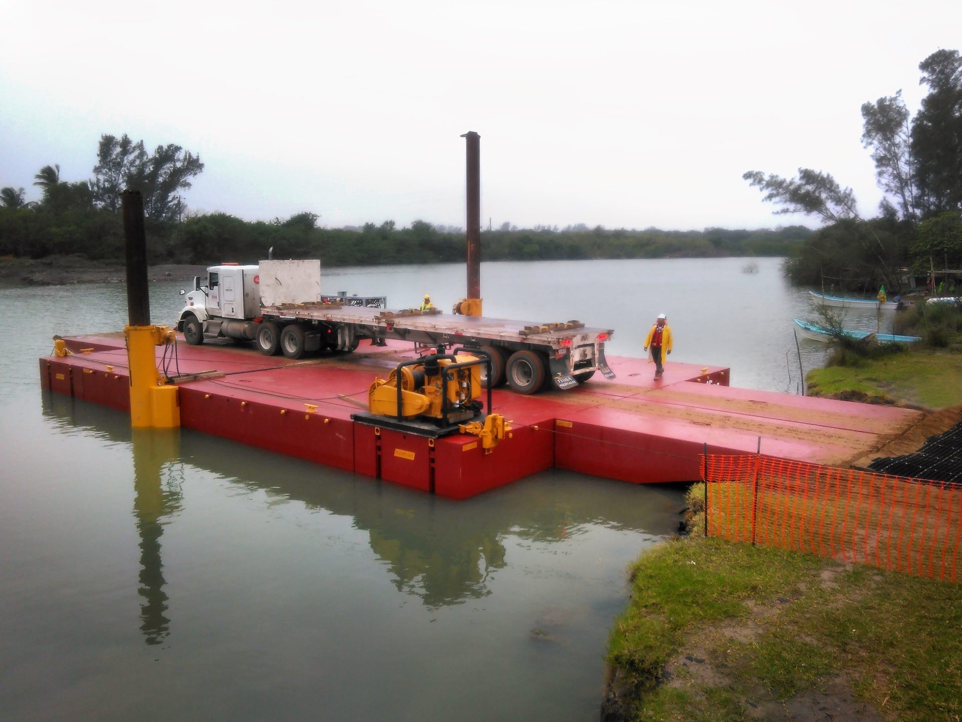Grupo Desarrollo Infraestructura, S.A. de C.V. (GDI) purchased a Series S-50 Flexifloat® ferry system to transport pipeline equipment across a lagoon to an island in Vera Cruz, Mexico. Previously the only practical access to the island was by traversing a small beach 25 miles south of the jobsite. Additionally, this beach was seasonally restricted due to nesting sea turtles and only accessible during low tide. The portable barge system allowed GDI to reduce their travel distance to approximately 500 feet, uninterrupted, saving them time and money as well as expediting the construction of the pipeline.