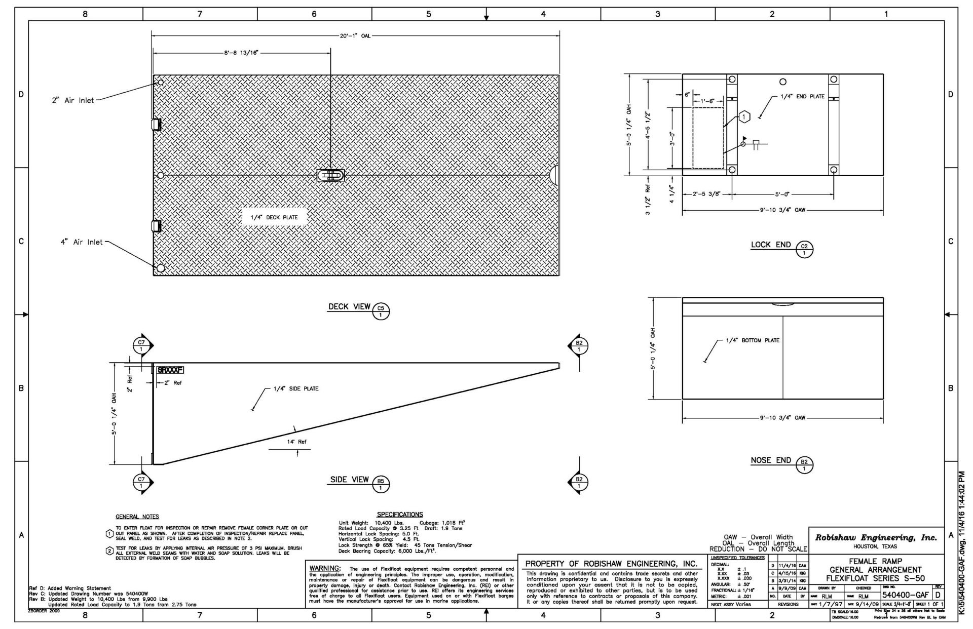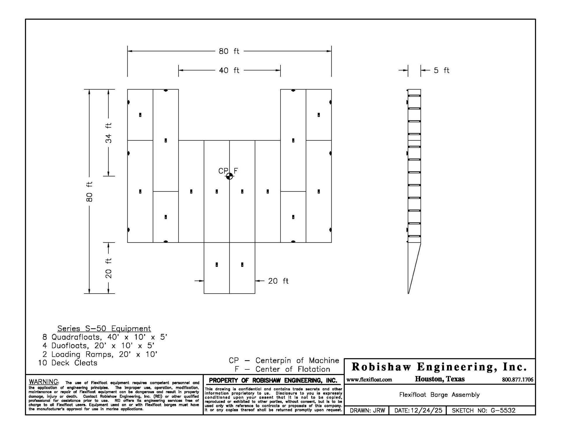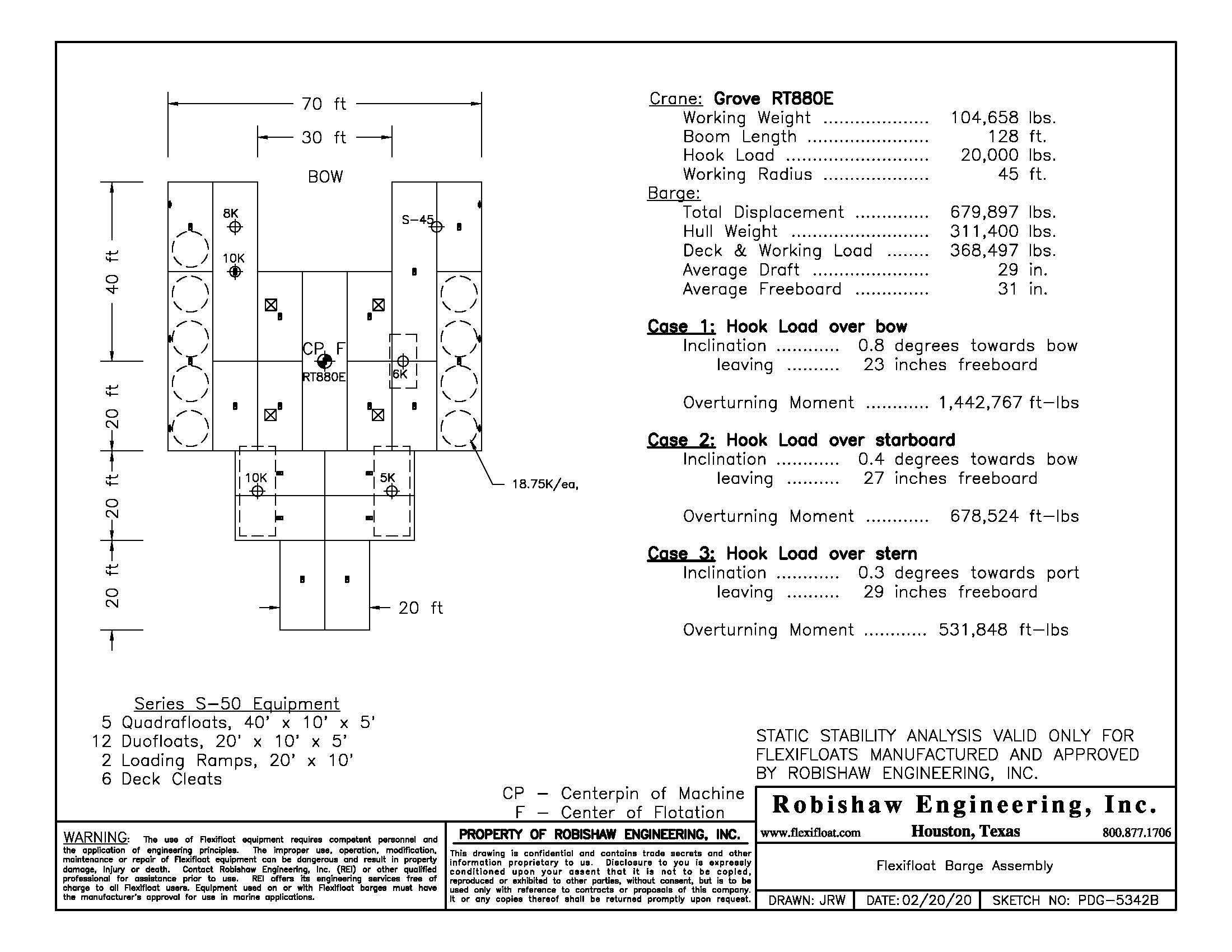 The 130-ton capacity Link-Belt RTC 80100 was also supported on a 60’ x 90’ S50 assembly. For all the projects mentioned, the Flexifloat Loading Ramps were utilized to simplify the loading and unloading of the RT cranes. These ramps are designed to be beached on shore for easy loading; and can remain on the assembly to provide additional deck space.