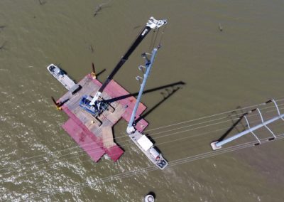 When tasked with setting transmission poles on Lake Ray Hubbard near Dallas, Texas, Auger Services, Inc. used a Series S-50 Flexifloat® spud barge to support their Mantis 15010 hydraulic crawler crane. A 60’ x 70’, slotted configuration was designed to support the 77-ton capacity crawler crane while drilling pier footings and setting the tubular steel monopoles. The 5-foot-deep hull drafted less than 30 inches in water depths as shallow as 4 feet. The 20’ x 20’ slot kept the needed working radius to a minimum while the barge maintained excellent stability while supporting the 240,000-pound deck load. Hydraulic winches were used to operate the anchoring spuds. The drilling contractor also used Series H-50 and S-50 transport barges to deliver materials from the shore to the work area.