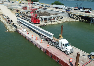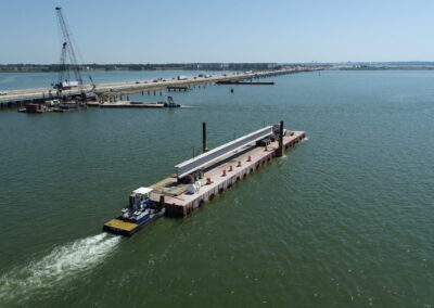 By allowing the tractor-trailers to pull directly on to the girder transport, SEMA was able to load the girder, transport the girder to the bent location, make the two-crane pick, return to the dock, and unload the empty tractor trailer in an efficient timeframe. All the while, the drilling contractor, ATS Drilling, was able to continue drilling the remaining pier shafts several bents ahead. The drilling platforms, along with transport barges for the cages and spoils, were also supported on Flexifloat assemblies.