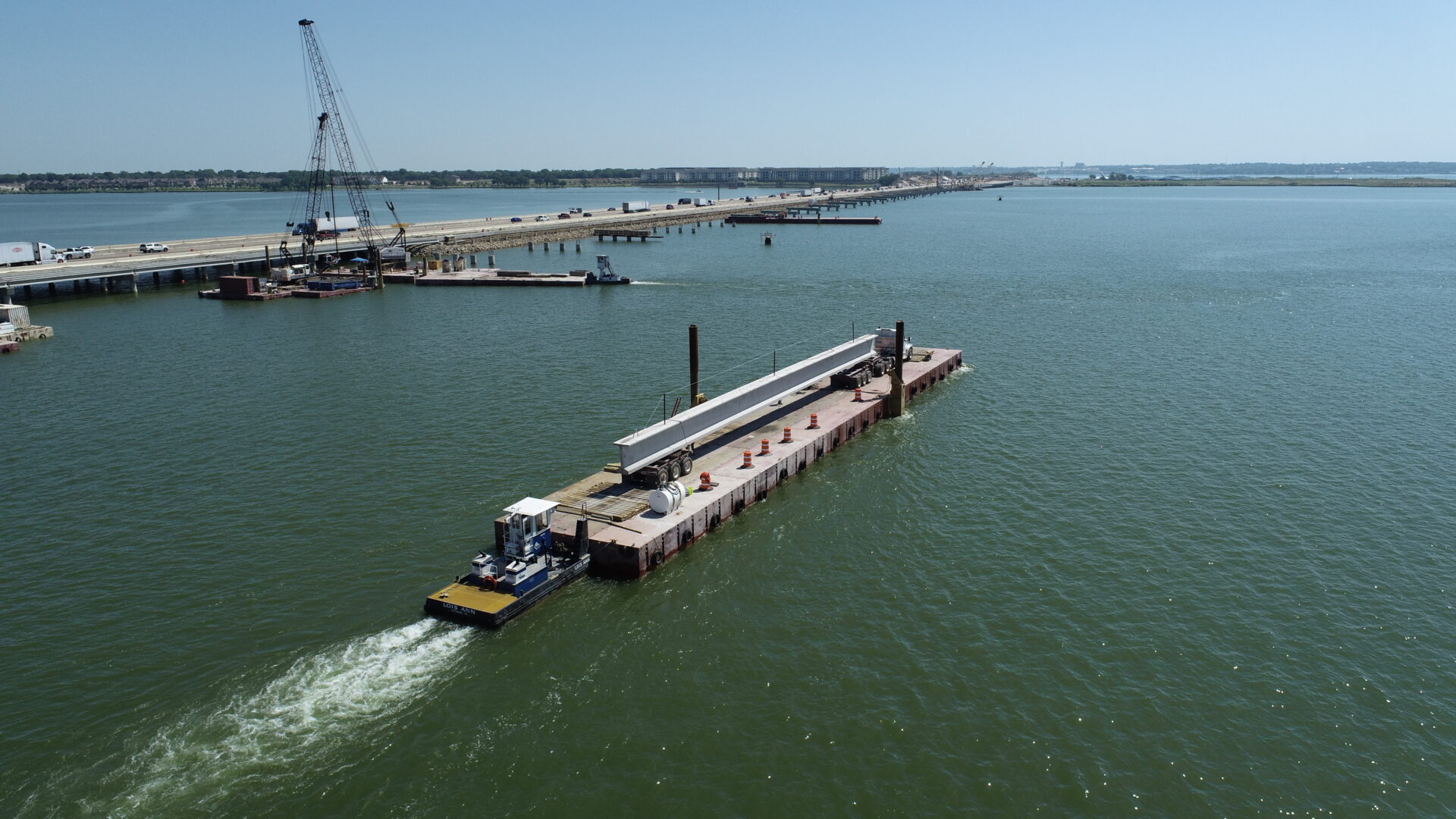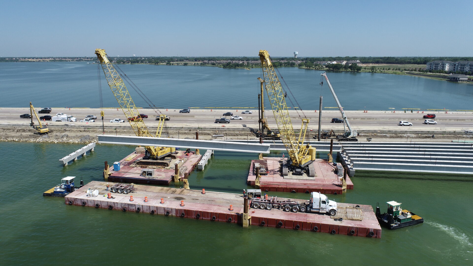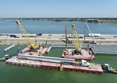 SEMA Construction sets TX70 girders on Lake Ray Hubbard using Flexifloat transport and crane barges.