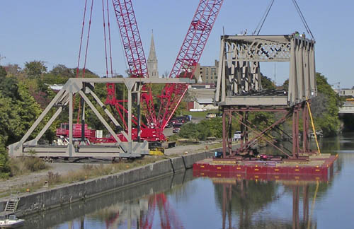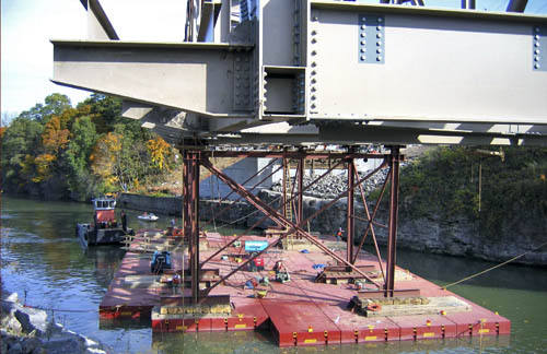 In October of 2004, roughly five months after the steel erection process began, the bridge was ready to be moved into place. The operation went smoothly, taking only eight hours to position and lower the bridge on to temporary blocking at the abutments. Once the structure was resting on the blocking, several flotation sections were selectively ballasted and the entire barge and shoring were floated away from the site. Later, the 600-ton bridge was lowered on to the abutment seats using hydraulic jacks.