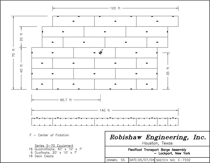 Based upon the calculated loads, Robishaw Engineering designed and provided a rectangular Flexifloat assembly which would adequately support the bridge and shoring during the erection process. However, as the bridge would be situated at a 45-degree angle to the narrow canal, it later became apparent that the turning of the barge to place the bridge in position would result in the corners of the barge striking the canal banks before proper alignment could be achieved. To overcome this final obstacle, the modular Flexifloat pontoons were simply reconfigured into an approximate parallelogram, thereby permitting full rotation of the barge without interference.