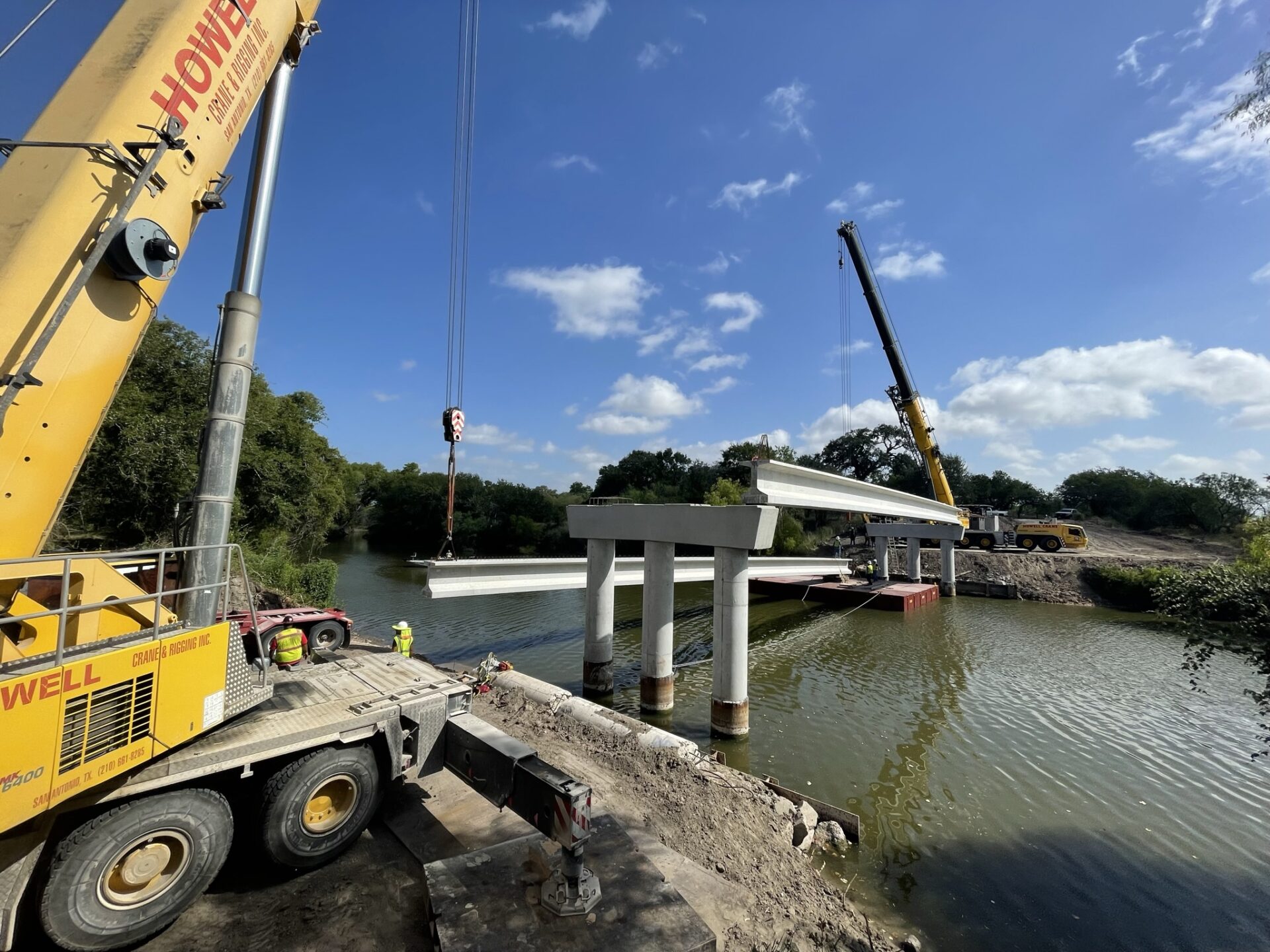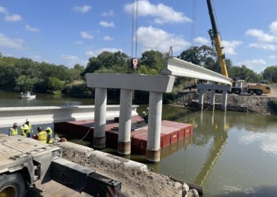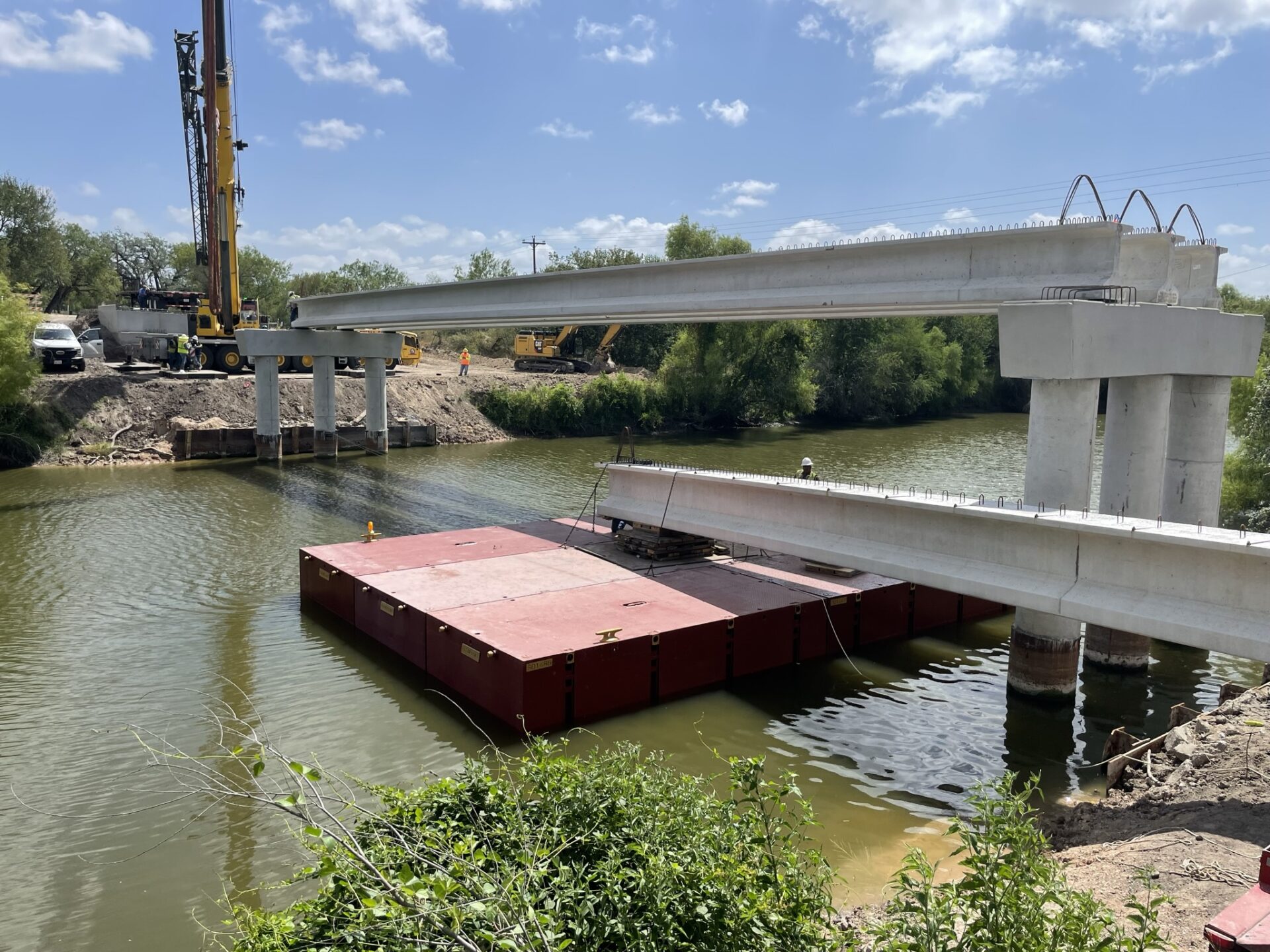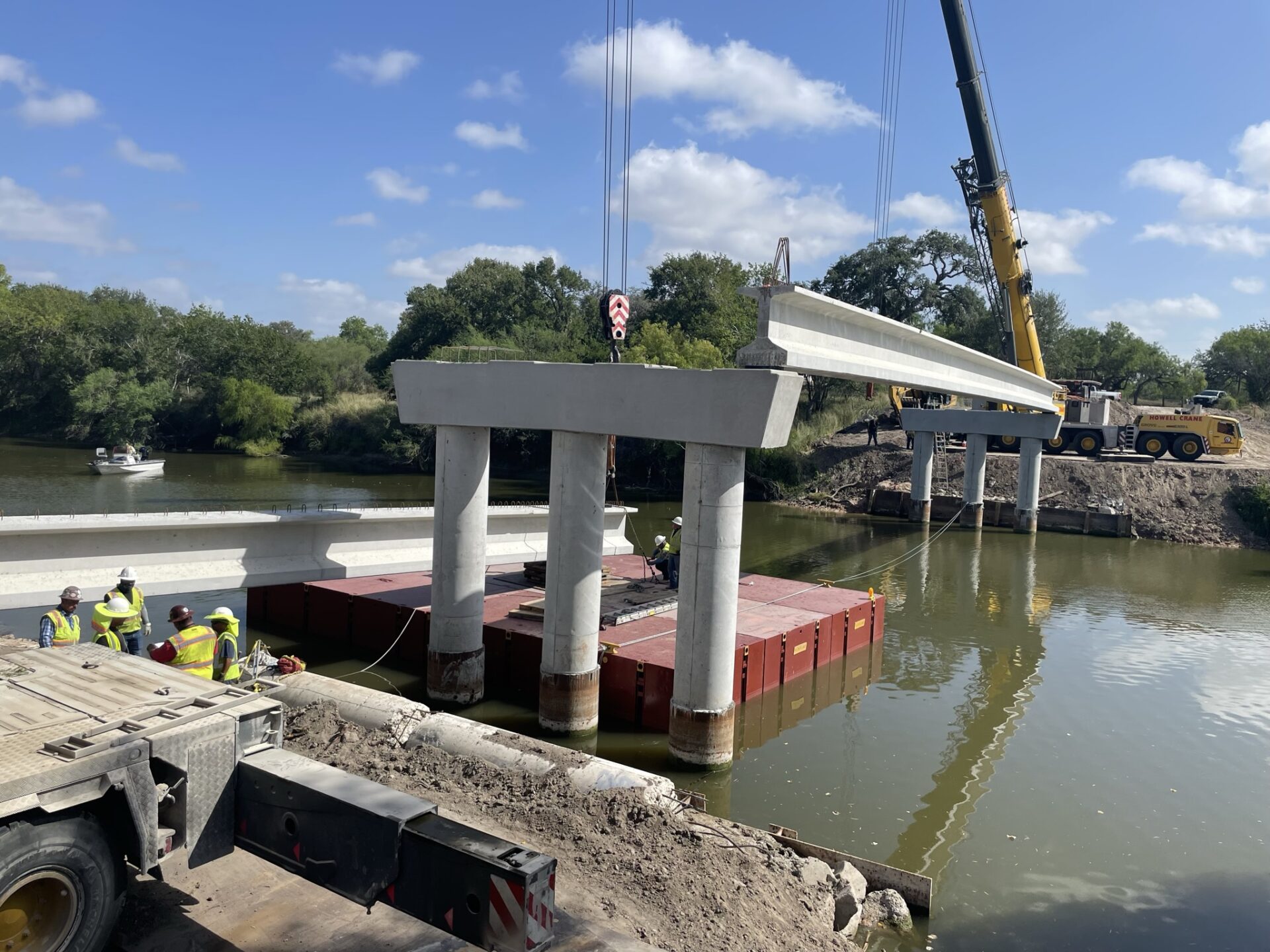 Relmco Inc. relies on Flexifloat to provide an S50 barge assembly for a bridge construction project near George West, Texas. Space limitations on the jobsite required a two-crane pick to handle each 80,000-lb concrete girder. The 30’ x 40’ transport barge designed to support the 47,000-lb cantilevered girder load was maneuvered 150 feet across the Nueces River. Once in position, truck cranes on each riverbank lifted the girders for placement onto the pier caps.