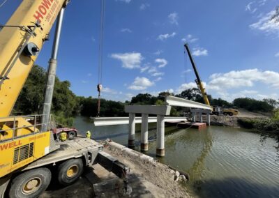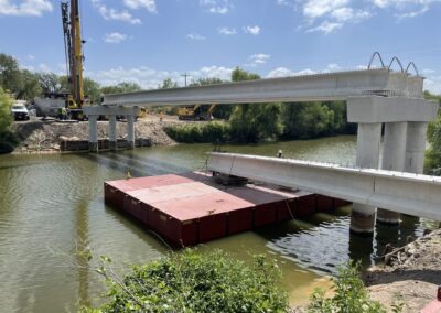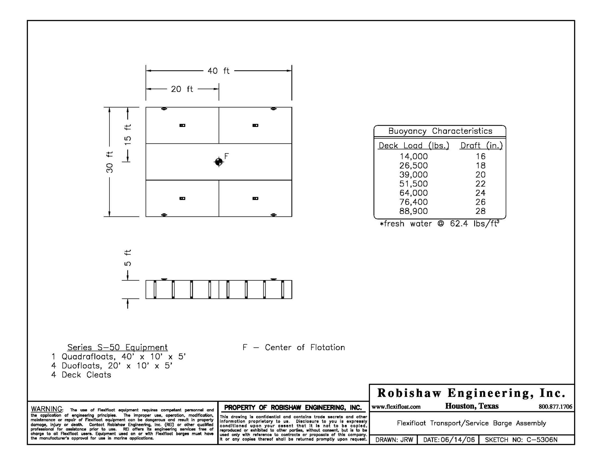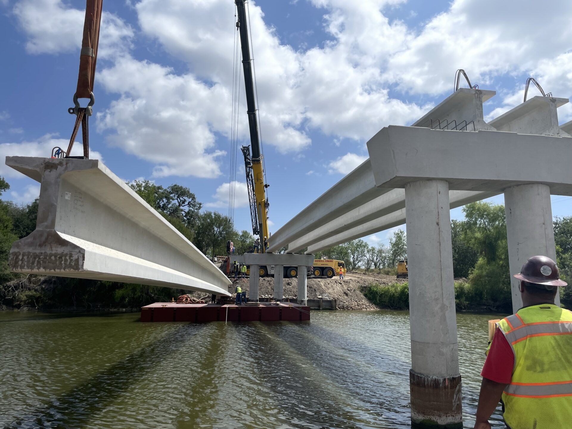 Relmco Inc. relies on Flexifloat to provide an S50 barge assembly for a bridge construction project near George West, Texas. Space limitations on the jobsite required a two-crane pick to handle each 80,000-lb concrete girder. The 30’ x 40’ transport barge designed to support the 47,000-lb cantilevered girder load was maneuvered 150 feet across the Nueces River. Once in position, truck cranes on each riverbank lifted the girders for placement onto the pier caps.