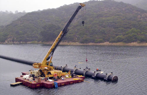 A Series H-50 configuration was used by Underwater Resources, Inc. to install 4,500 feet of pipe used to carry drinking water. A 35-ton rough terrain crane attached weights to the pipeline prior to submersion/installation.