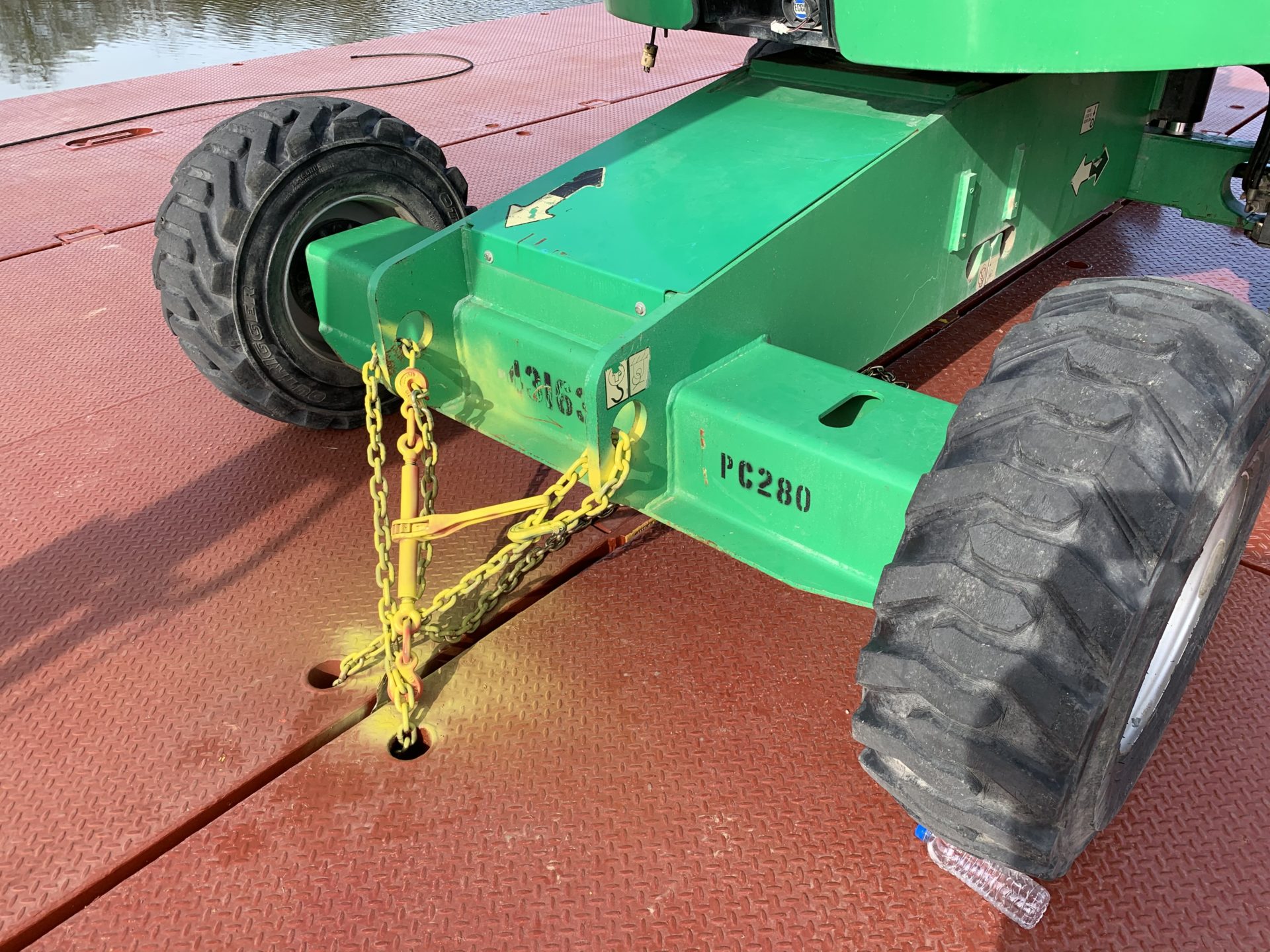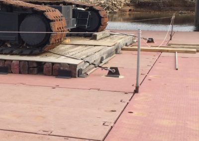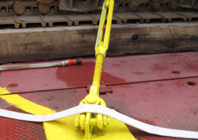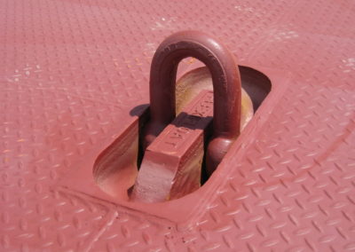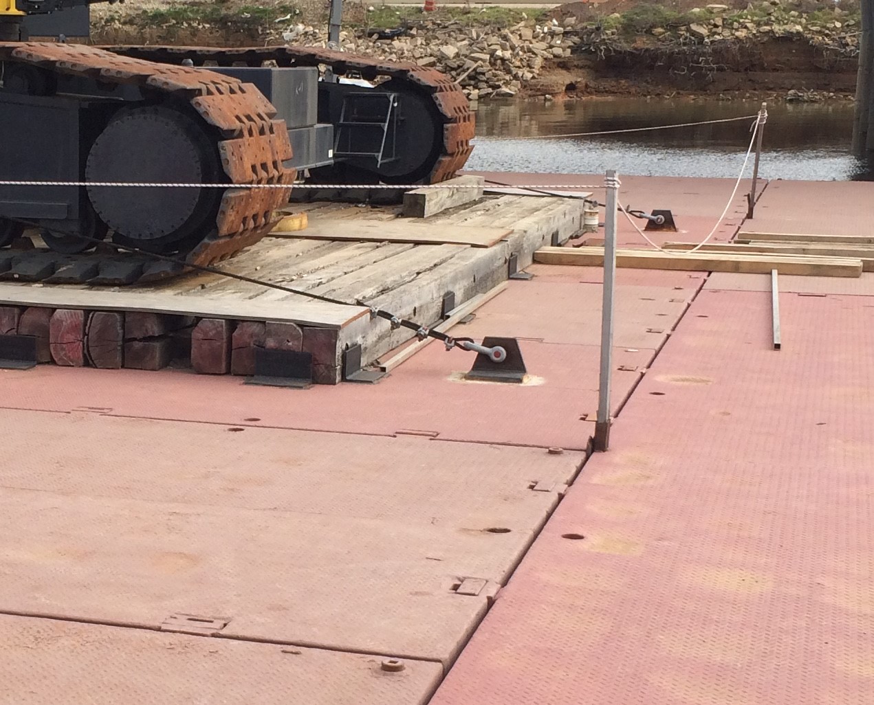 Safety regulations often require contractors to secure equipment to the Flexifloat decks. The tube turns located along the edge of the Flexifloats are rated for 5-tons each and can often be utilized for tying down machinery with chains or wire rope. Contractors can also weld doubler plates and padeyes to the Flexifloat deck where anchor points are required. Any welding to rental equipment should be removed and ground back down to the original surface before return. The 25-ton lift shackle located at the center of the deck may also be used as a tie-down location as long as the shackle is not side loaded. Always refer to the manufacturer’s guidelines regarding securing their machinery with appropriately sized chains, straps, etc.