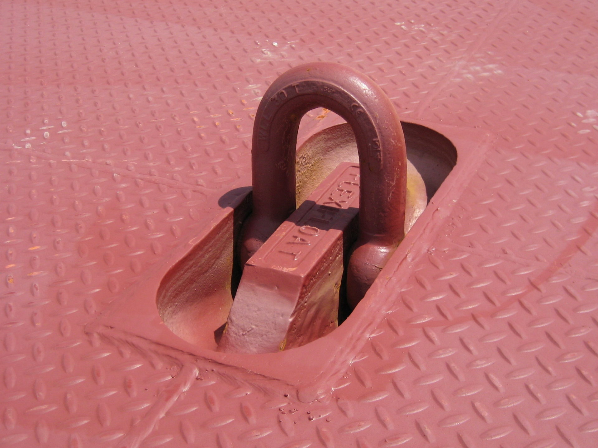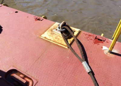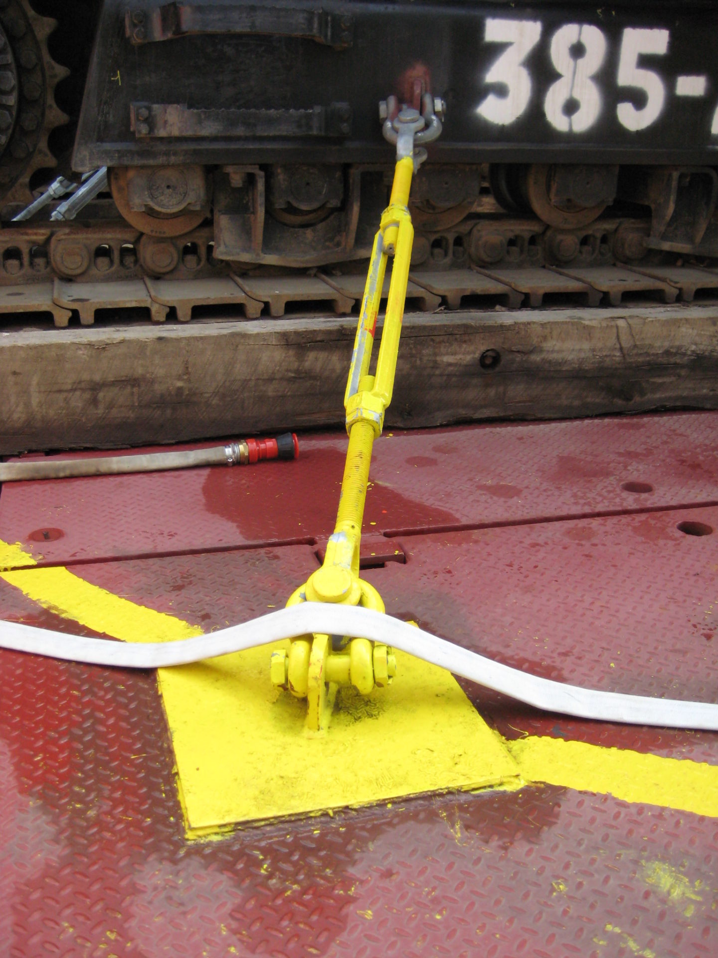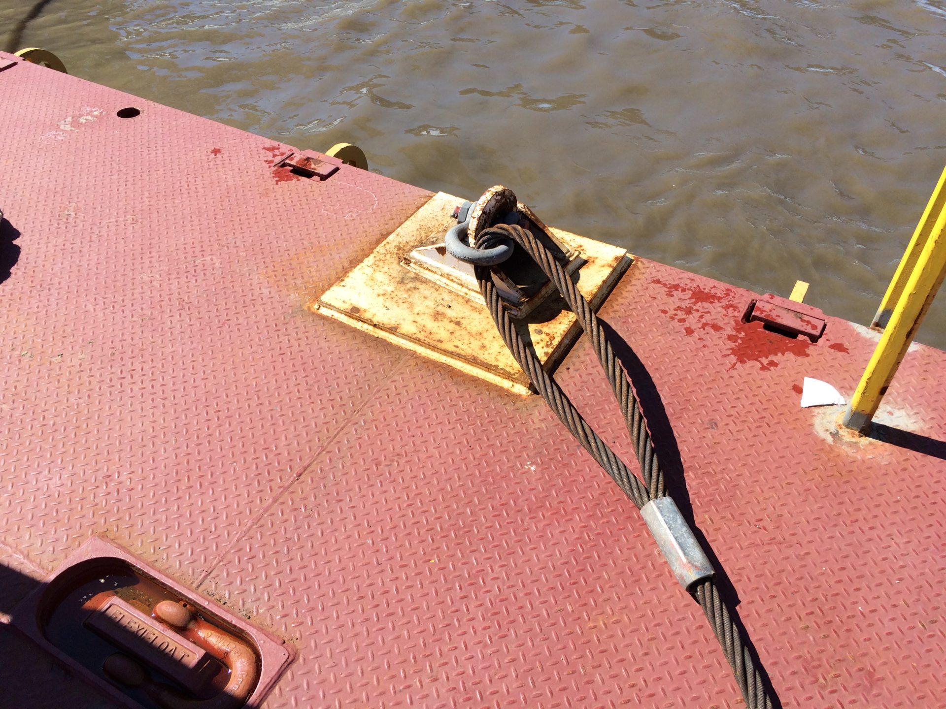 Safety regulations often require contractors to secure equipment to the Flexifloat decks. The tube turns located along the edge of the Flexifloats are rated for 5-tons each and can often be utilized for tying down machinery with chains or wire rope. Contractors can also weld doubler plates and padeyes to the Flexifloat deck where anchor points are required. Any welding to rental equipment should be removed and ground back down to the original surface before return. The 25-ton lift shackle located at the center of the deck may also be used as a tie-down location as long as the shackle is not side loaded. Always refer to the manufacturer’s guidelines regarding securing their machinery with appropriately sized chains, straps, etc.