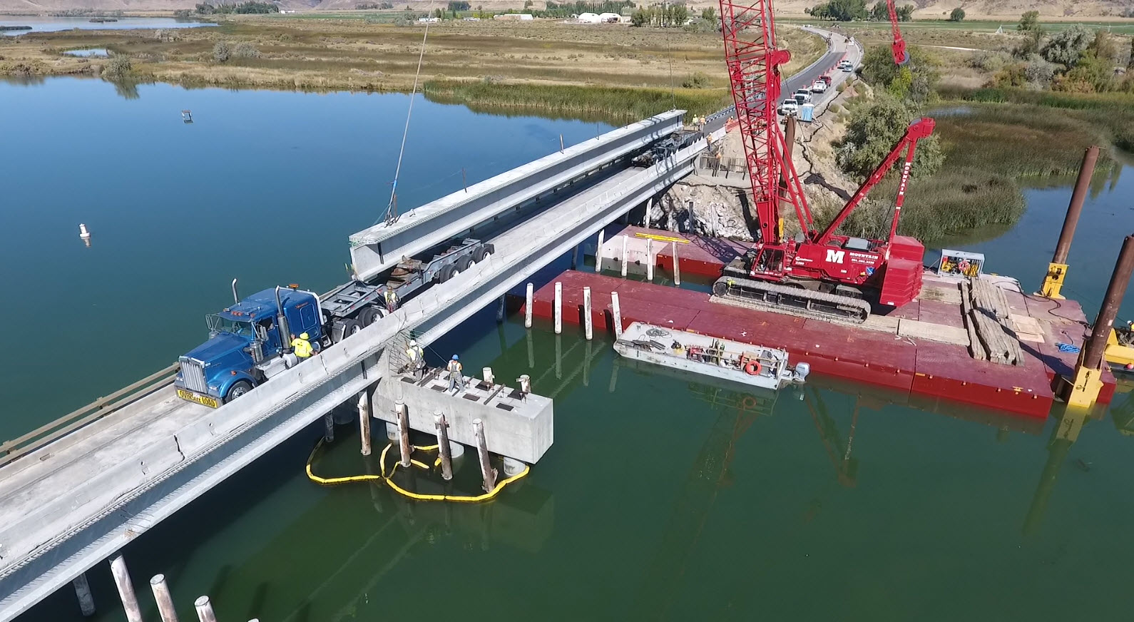 Cannon Builders, Inc. utilized a “U”-shaped, 110’ x 60’ Series S-70 Flexifloat® configuration to support a 658,000-lb Manitowoc 2250 Series 3 crawler crane for a bridge project on the Snake River in Idaho. Equipped with a 180-foot boom, the 300-ton capacity crane set 157-foot-long concrete girders weighing 194,000 lbs. The 20’ x 40’ slot allowed the barge to straddle the existing bents while maintaining a safe lifting radius. The 110-foot-long hull had sufficient stability to allow the crane to move back, off center by approximately 8 feet, reducing the number of times needed to reposition the entire barge. Three hydraulically-operated spuds anchored the 5,600-sq-ft platform in 10 feet of water.