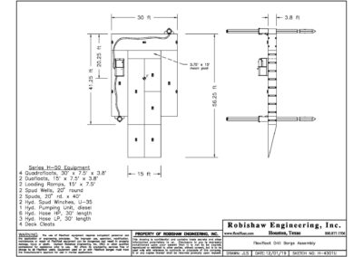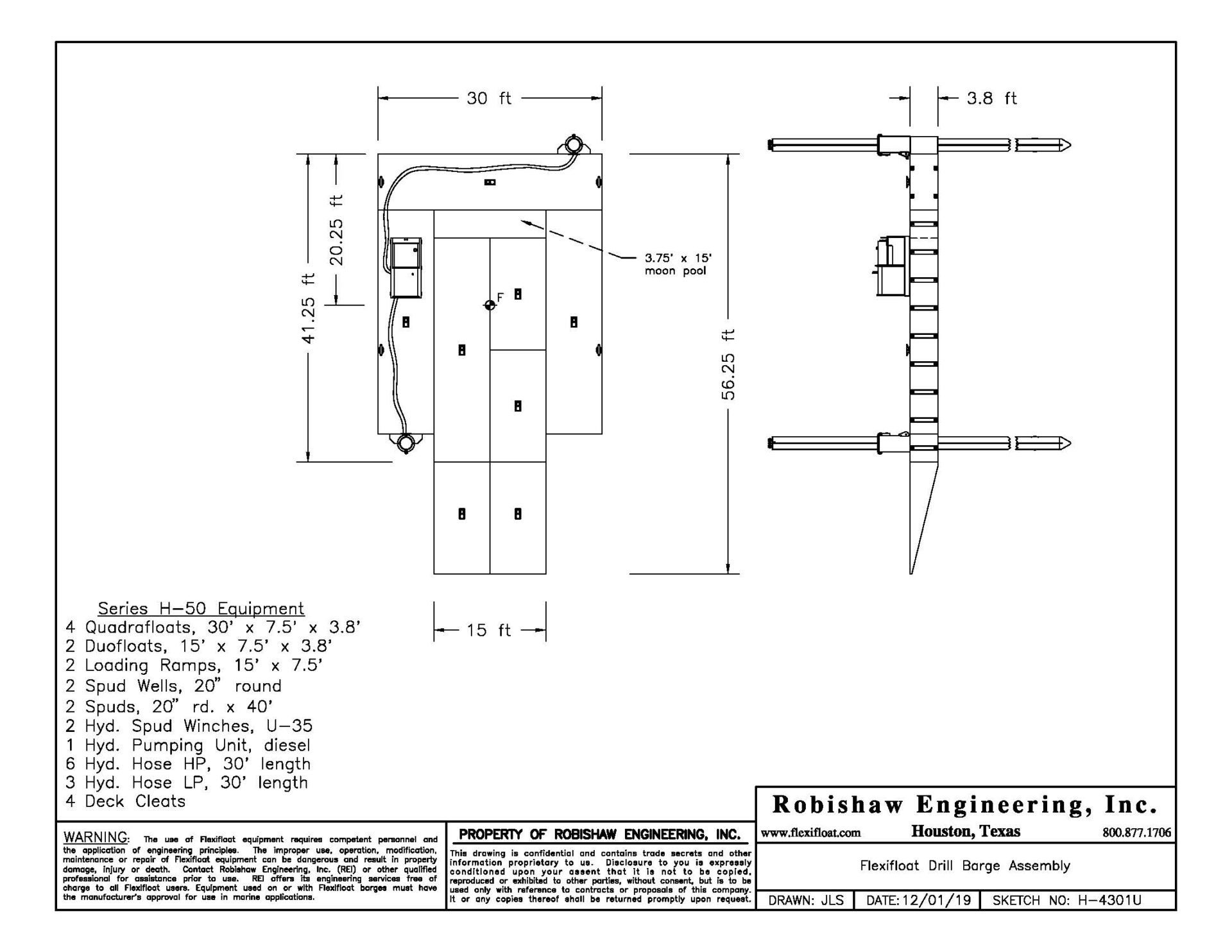 Grillot Construction, working with Texplor, used a CME-75 truck-mounted drill rig to perform some core drilling on Lake Texoma. The 33,000-lb. rig was supported on a spud barge made up of H-50 Flexifloats®. H-50 Loading Ramps were attached to the end of the assembly to assist in loading the truck-mounted rig. By offsetting the two center Flexifloats®, a 15’ x 3.75’ “moon pool” was created to drill through. The contractor placed steel plate over the moon pool and achieved their core drilling through a small hole they cut into the plate. A hydraulic pumping unit and hydraulic winches were also included with the Flexifloat® equipment to raise and lower the spuds.