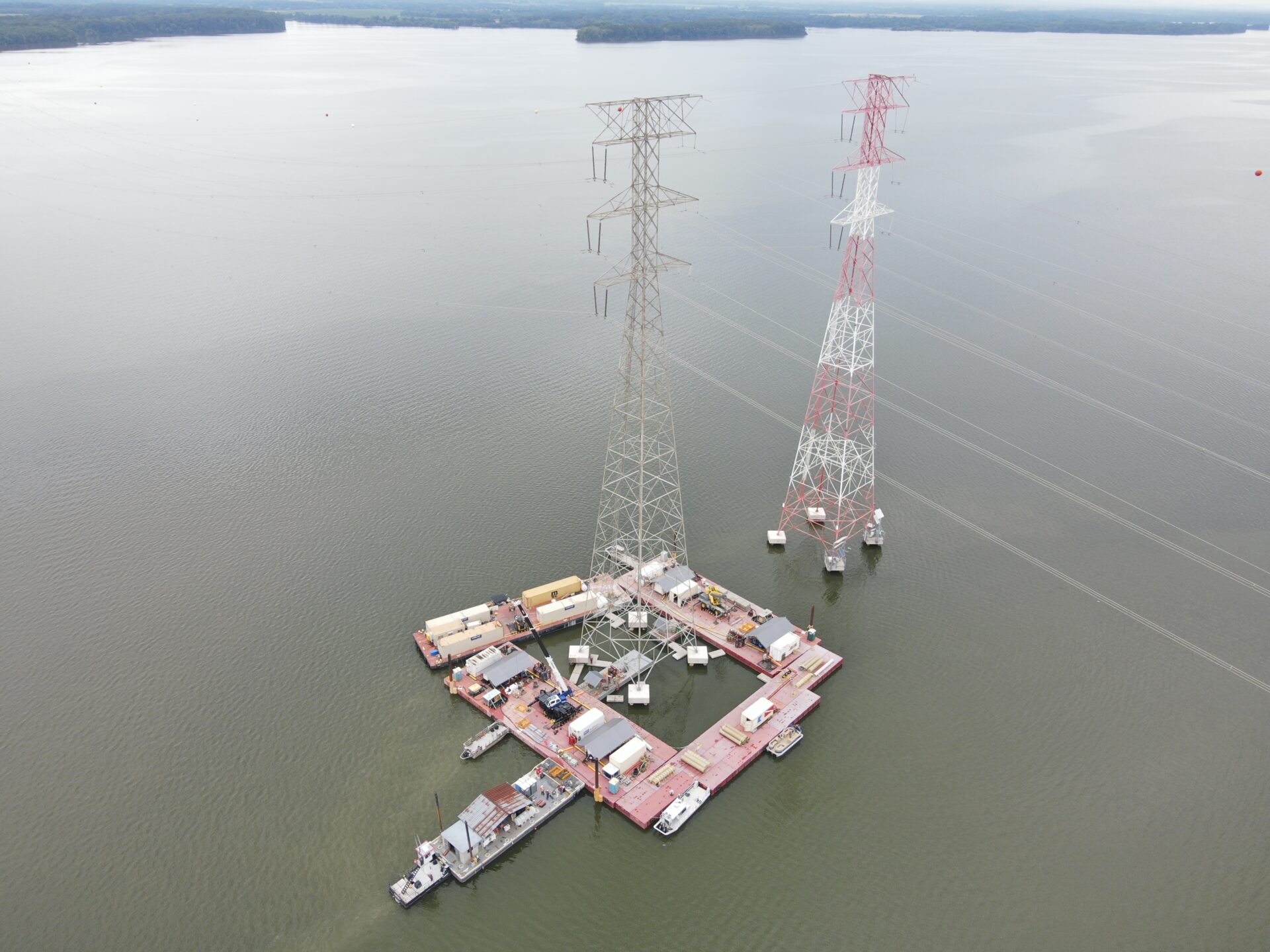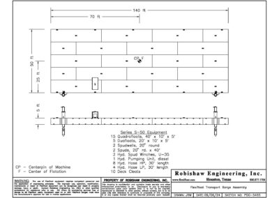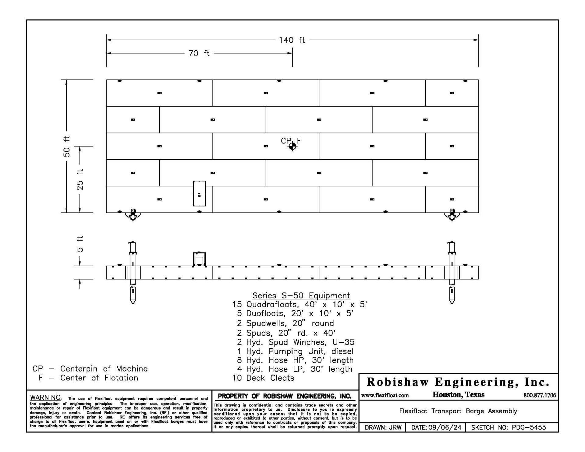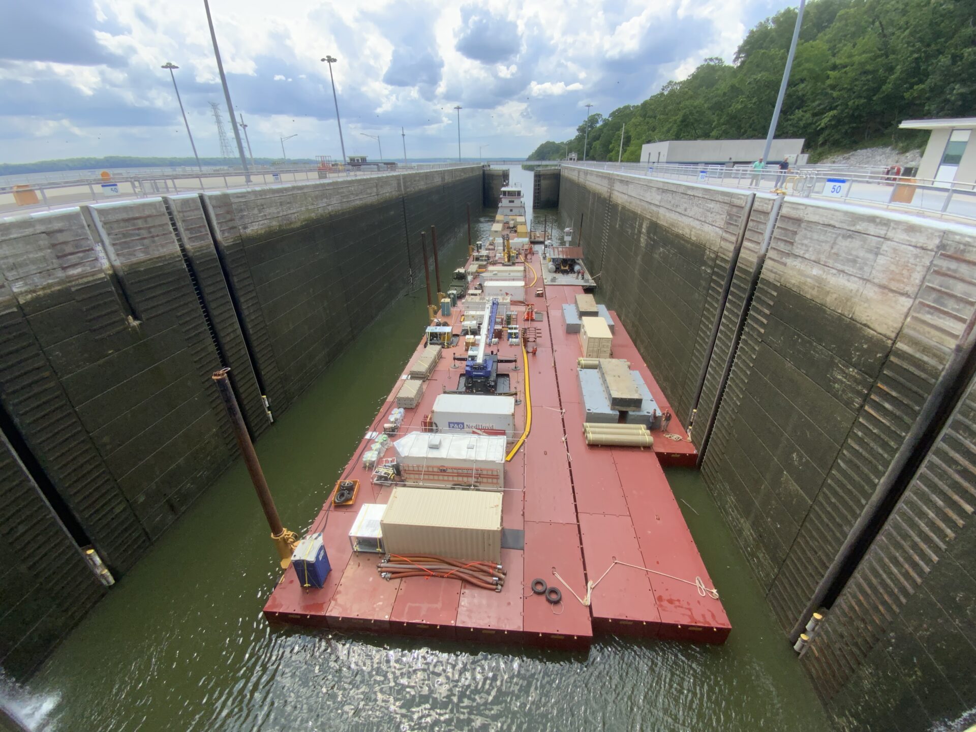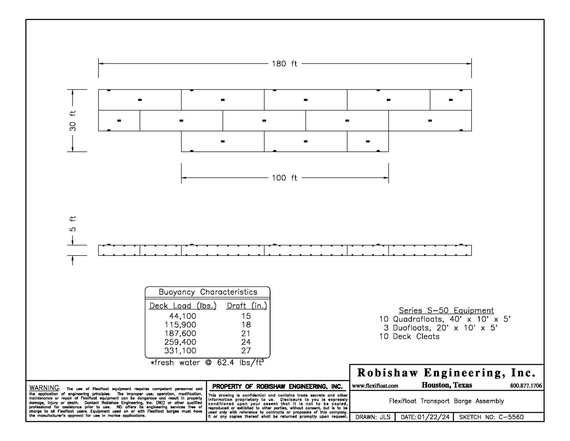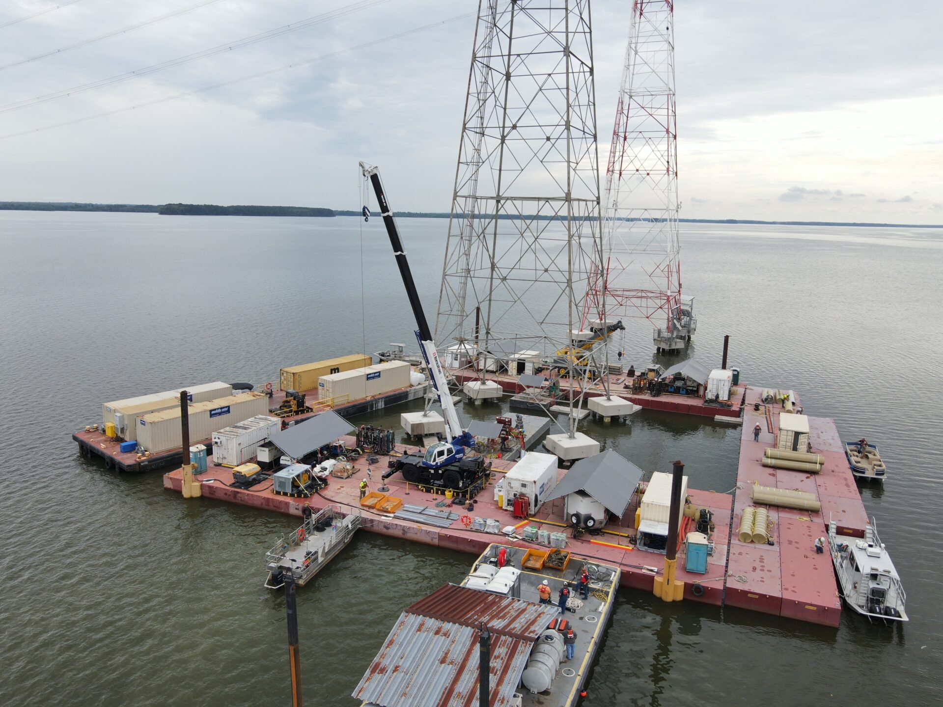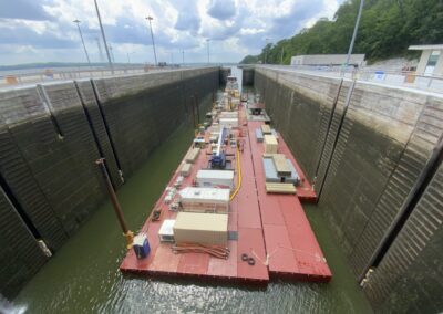 The Tennessee Valley Authority (TVA) utilized multiple S-50 Flexifloat assemblies to conduct work on one of their transmission towers. Two 50’ x 140’ S-50 assemblies were requested for supporting 35-ton capacity RT cranes and miscellaneous equipment. A 30’ x 180’ S-50 assembly was used as a transport barge for bringing materials to the site. The assemblies were moored together and pushed through the Wheeler Lock on the Tennessee River prior to working at the project site.