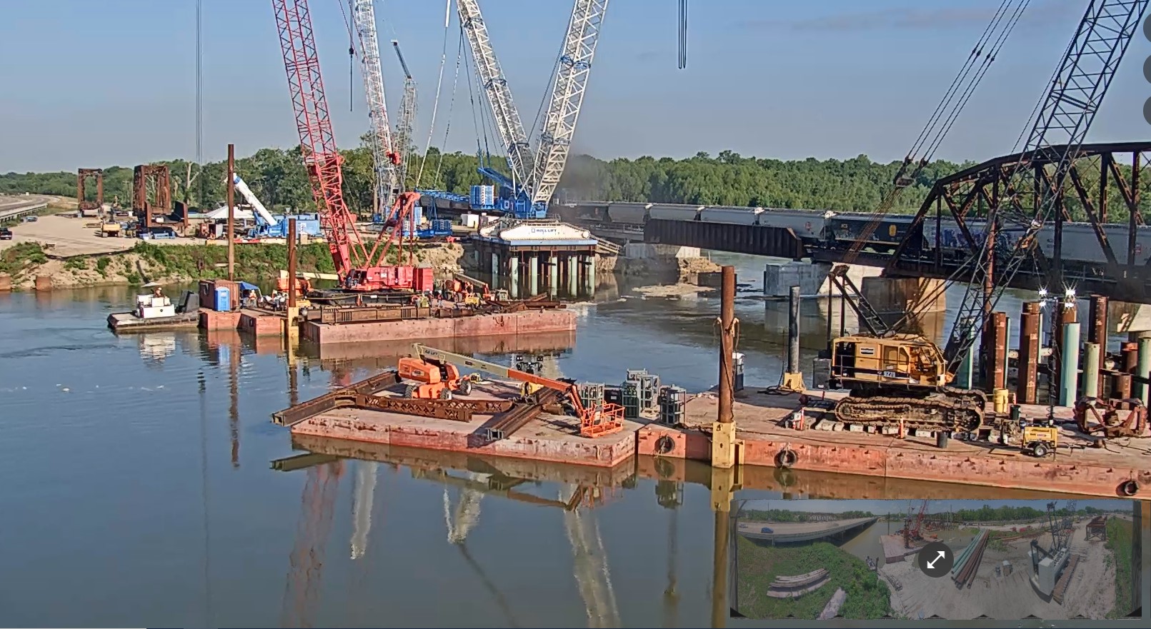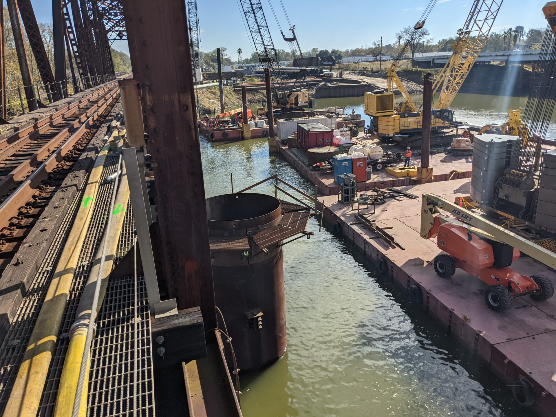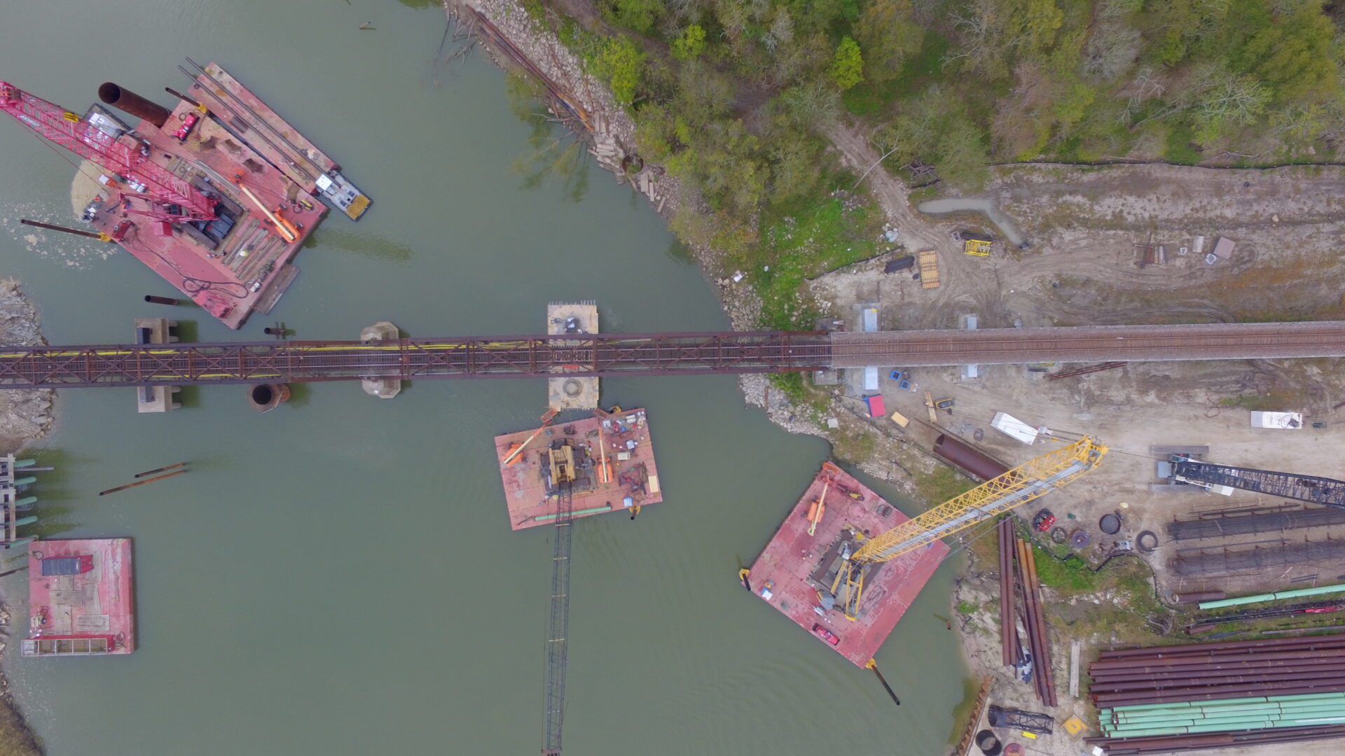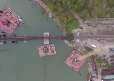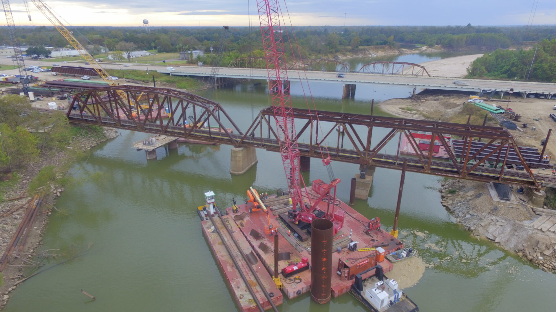 The new bridge piers required four 200 ft. long 10 ft. diameter drilled shafts for the two piers located in the Trinity River. A Liebherr LR-1300 crawler supported on an 80’ x 80’ x 7’ Flexifloat assembly was used to drive the 10’ diameter drill casings, and a Kobelco CK1600G crawler on an 80’ x 90’ x 7’ U-shaped S70 assembly was used to drill the shafts.