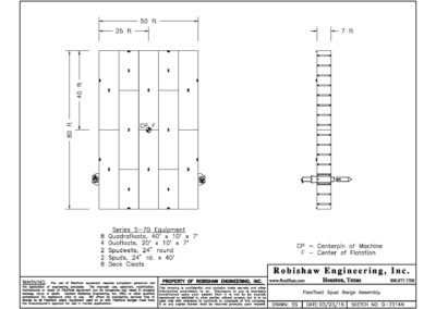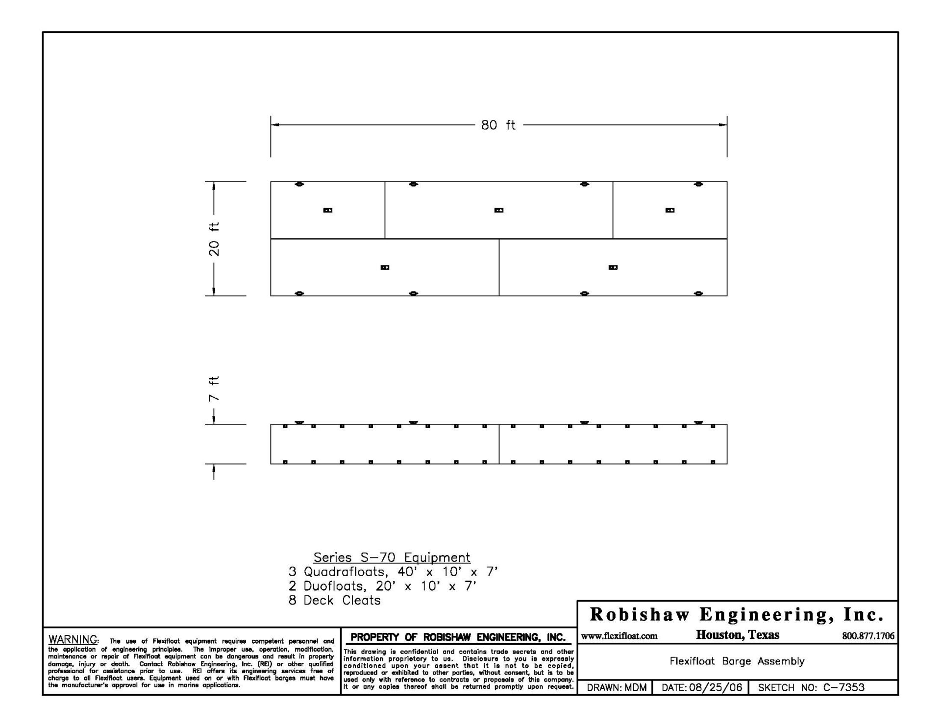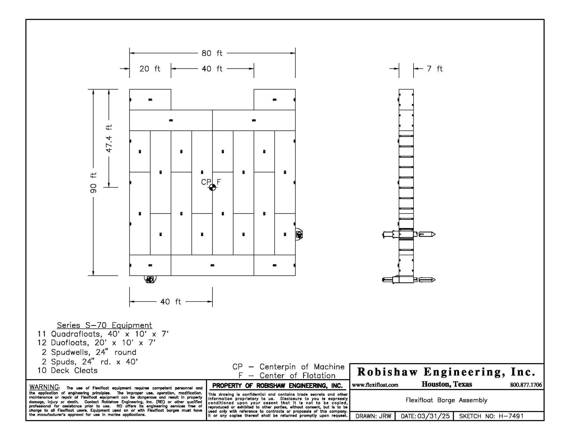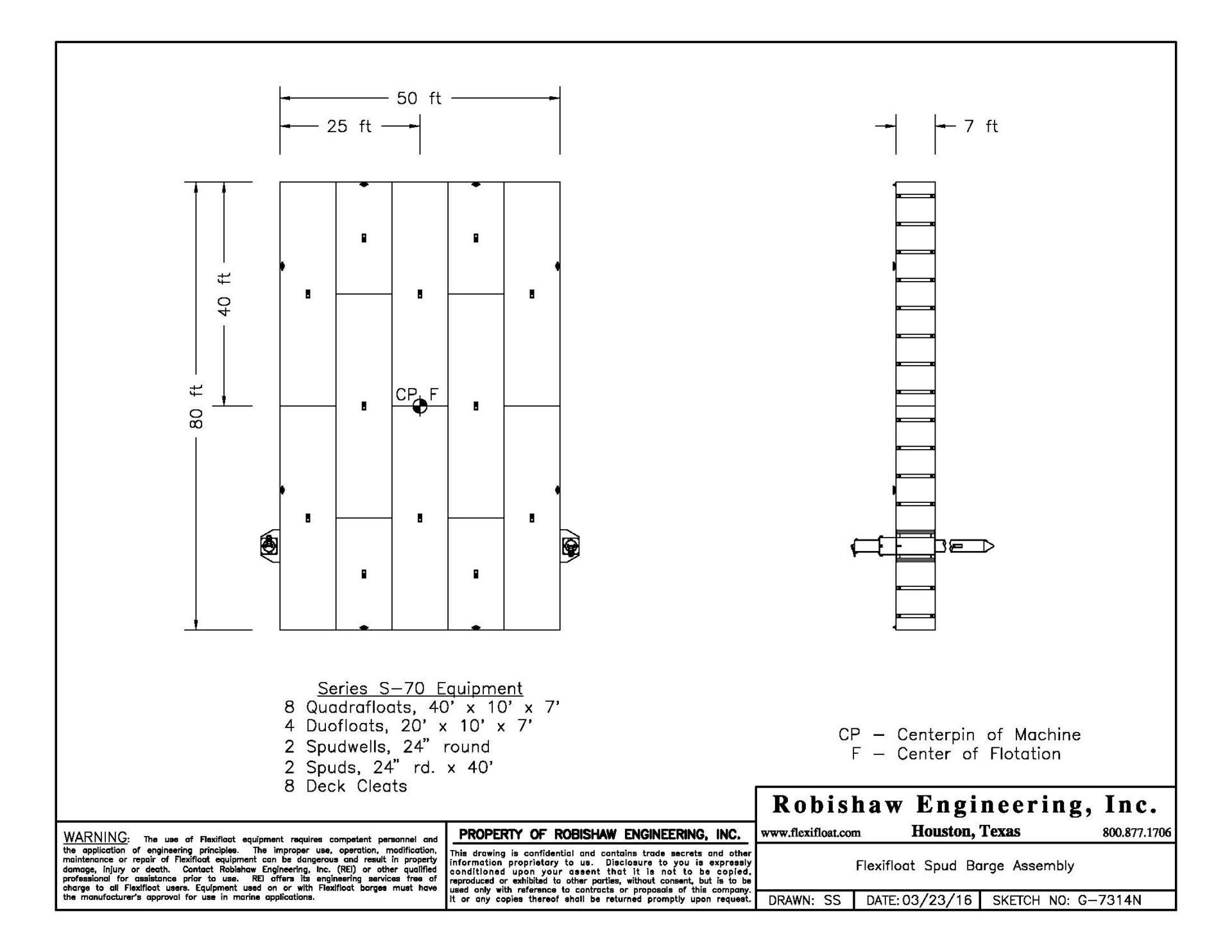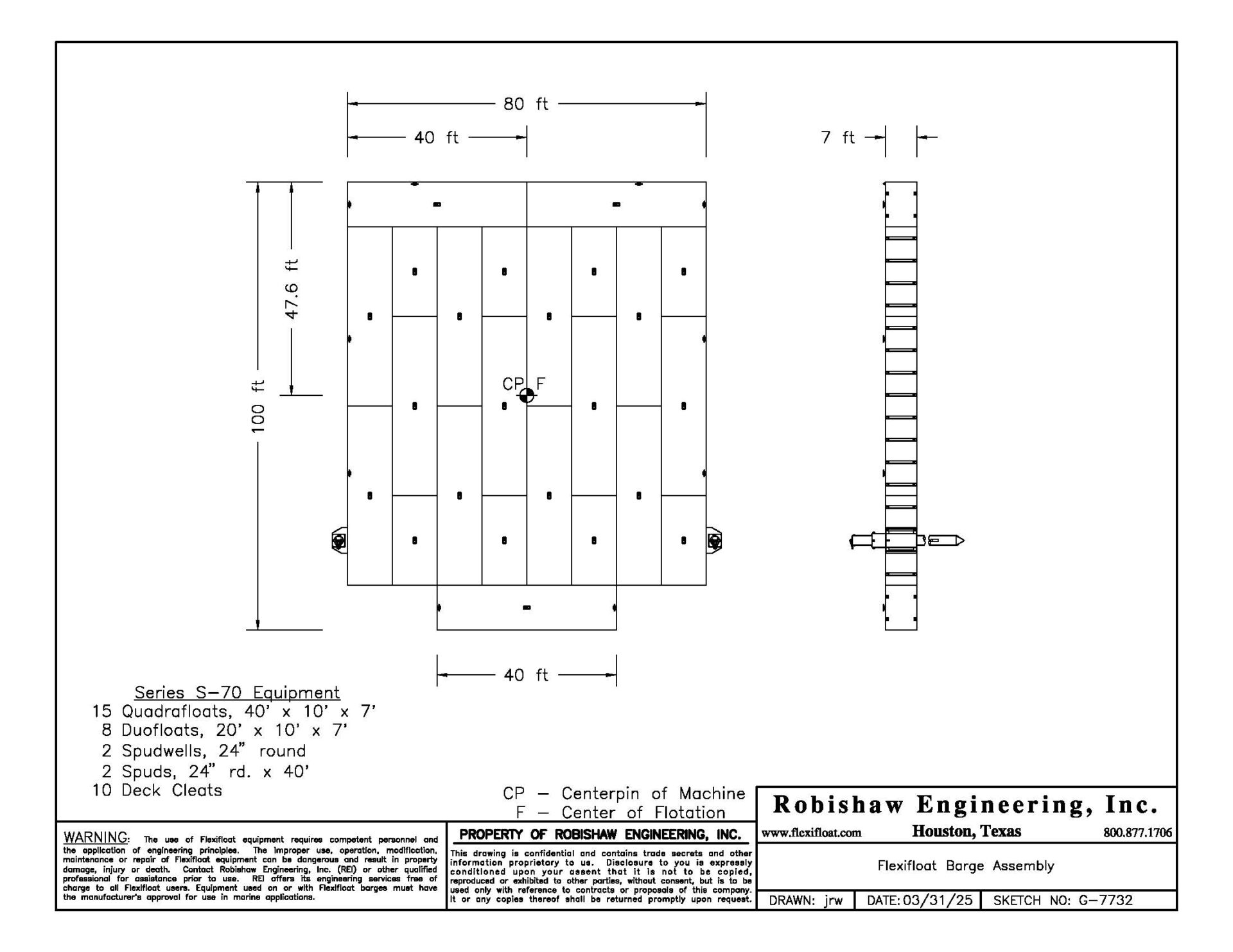 An 80’ x 90’ x 7’ Flexifloat assembly was used to support A. H. Beck’s CAT 352F drill rig and Roll Lift’s Liebherr LTR 1220 crane. This assembly was also used later in the project to support a Manitowoc 2250 Series 3 crawler. A 50’ x 80’ x 7’ spud barge was used to support an American 9270 working a clamshell.